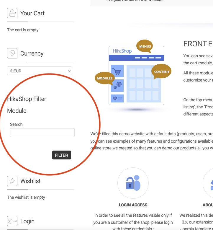 - You can create a filter of the type "text" via the menu Display>Filters of the HikaShop backend and then configure a HikaShop filter module via the Joomla modules manager. Filters can do a lot more than a text search. You can have dropdowns, checkboxes, cursors to filter out your products listings based on criteria (custom product fields, characteristics, categories, brands, etc). However, this capability is only available in the Business edition of HikaShop: