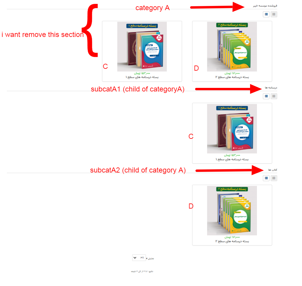 I have a category called A and I have two subcategories called subA1 and subA2. I have two products named C and D. I set up a menu to display the products (hikashop Product Listing menu). In the menu settings, I set the value of "main category" to A and put product C in subA 1 and product D in subA 2. I also set the sub "element filter" value to "Grouped by category". When I check the front of the site, it does not display any products. If I put those two products C and D in category A with the aforementioned settings(don't remove from it's subcategory subA1 and subA2), the front of the site will display three parts of category A, category subA 1, and category subA2 with repeated product. I want to have a parent category that does not have any products and all products are placed in its subcategories and the menu created by me will intelligently display the products in their own categories.