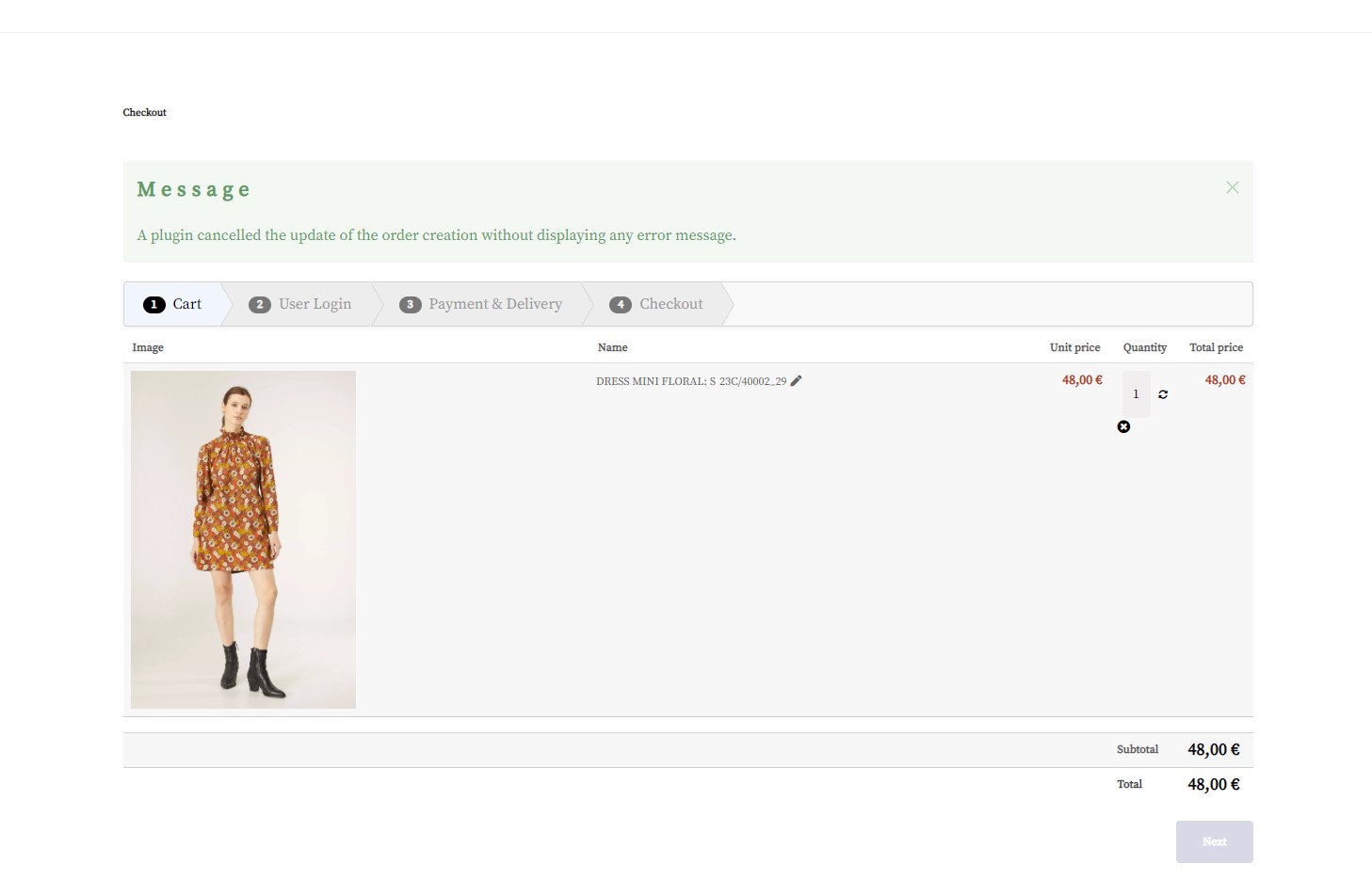 'A plugin cancelled the update of the order creation without displaying any error message.'