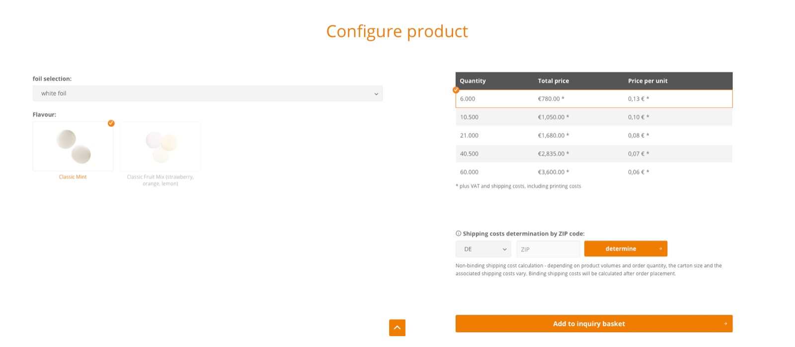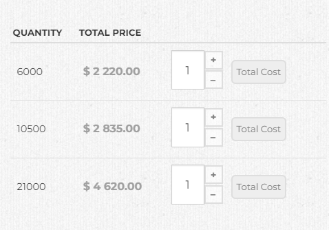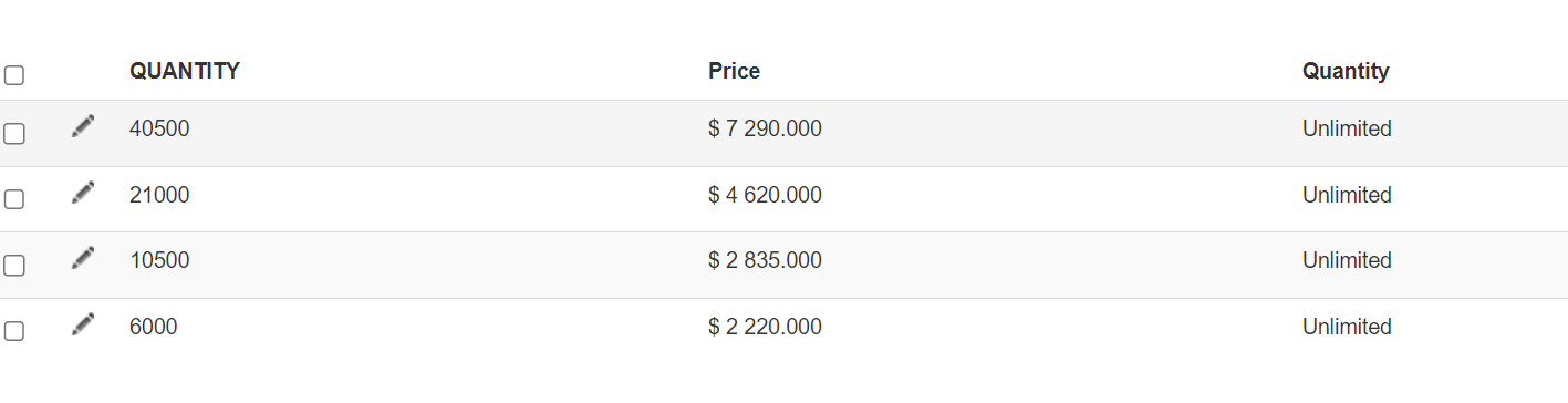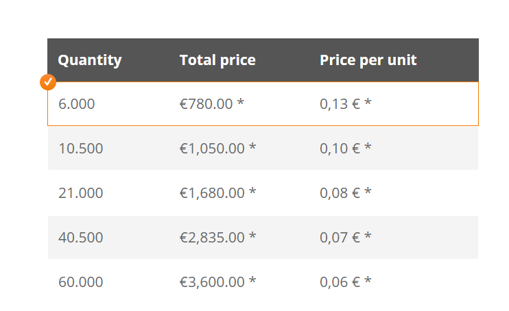 Then, with a bit of javascript customization in the product / show_block_characteristic view file, you can make it so that when the customer clicks on a row of the table, it adds a specific class to the row and set its quantity to 1 and the quantity of the others to 0, and then with some CSS customization, you can have the row with the specific class stand out as selected, and hide the quantity input field column from the view of the user. A bit of PHP customization there would also allow you to add the price per unit column in that same view file.