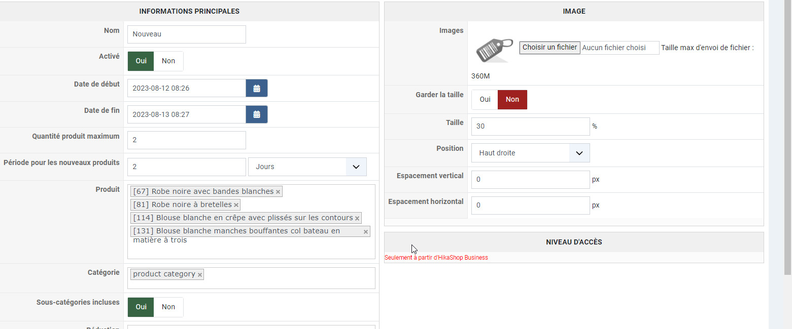 Cela fait beaucoup de contraintes pour un seul badge. Par exemple, pour le produit "Robe noire à bretelles" je vois sur votre site qu'il y a plus que 2 unités en stock. Donc il est normal que le badge ne s'affiche pas pour ce produit à cause de cela, sans parler des autres contraintes.