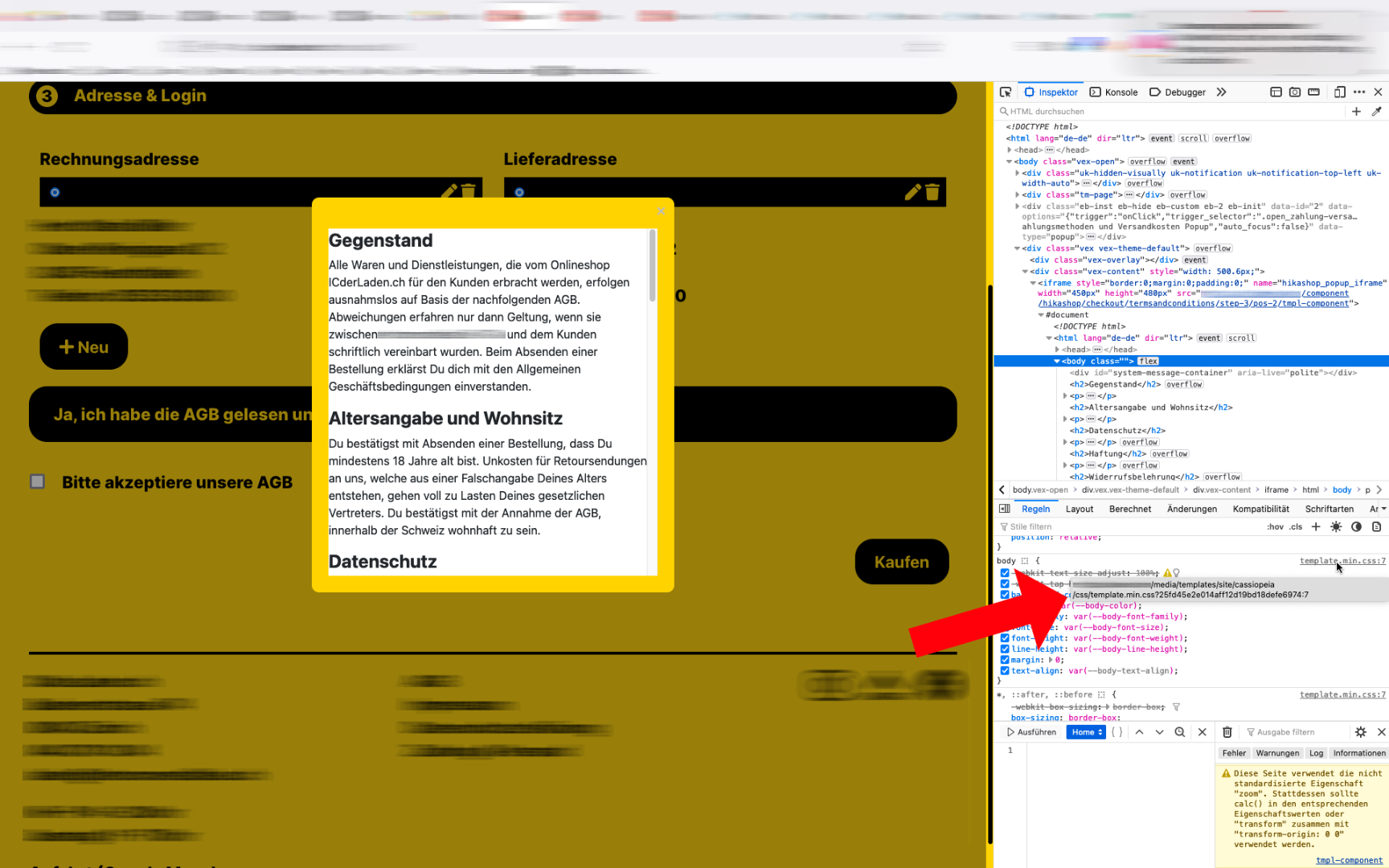 How can I style the pop-up? I was able to control the frame via CSS, but unfortunately the content (body) doesn't work because it is integrated via an iframe. During the analysis I found out that the popup accesses basic parameters of the template Cassiopeia (see screenshot). However, another template is active, Cassiopeia is not used on the entire website.