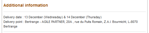 After copying and paste from HIKASHOP DEMO (version 3.2.1) the email configuration, I lost part of the information which was shown in Additional Information (see printscreen). In particular, the information regarding the delivery point is now missing in the email received by the client after the order is placed.