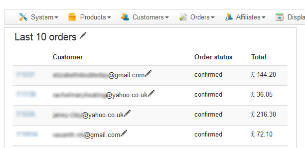 In the Hikashop widget panel, I have "last 10 orders",