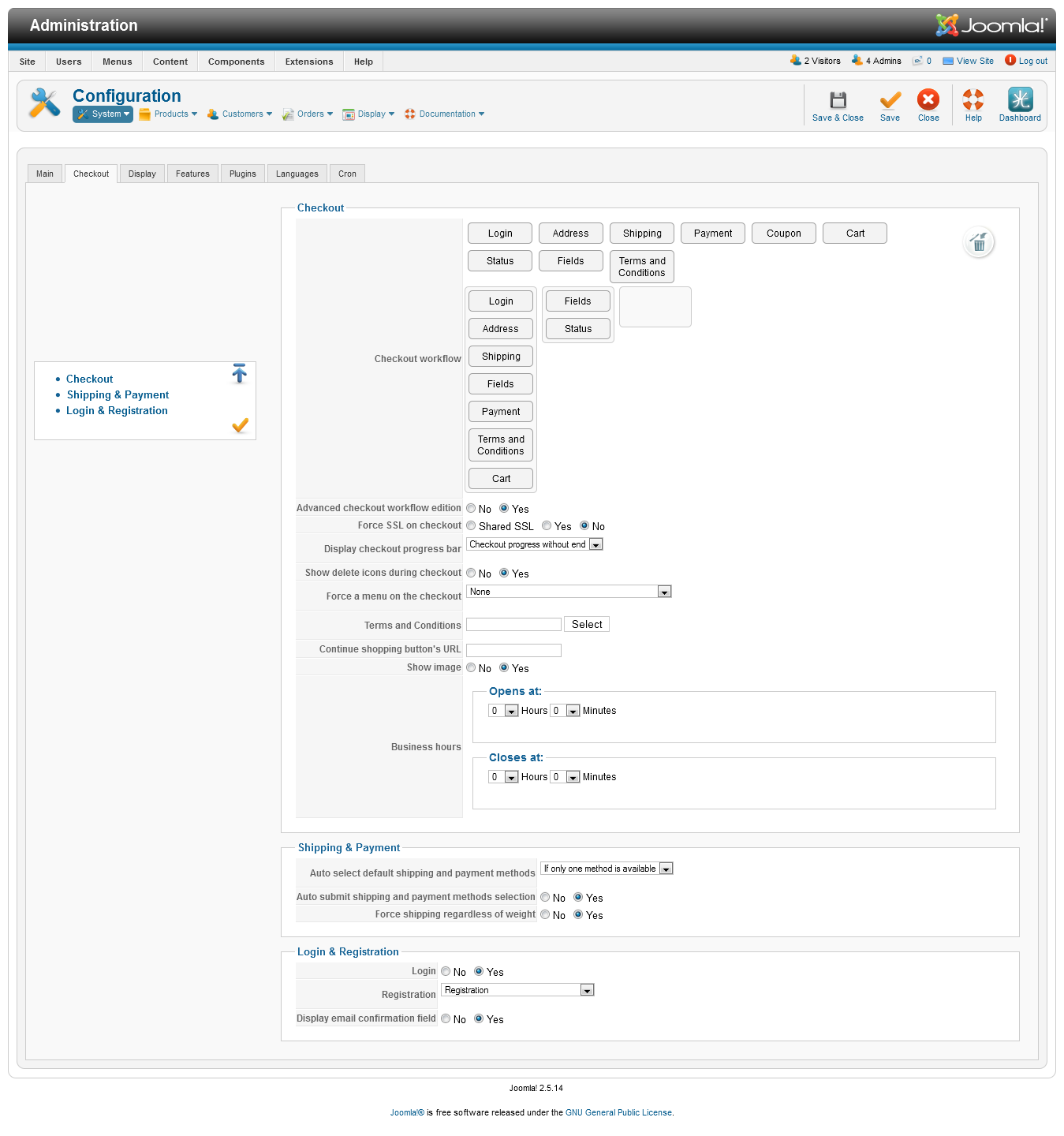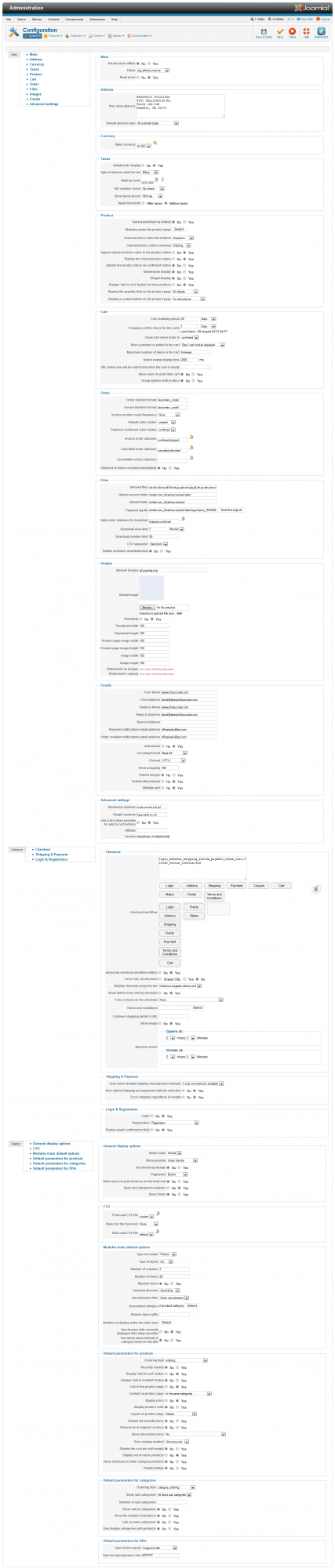 - Your checkout workflow through "Hikashop->System->Configuration->Checkout"