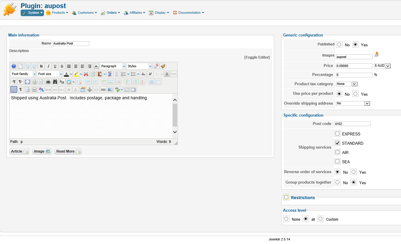 AusPost plugin dated 12/08/2013 does not work and does not show "Additional Charge" field (in Hikashop Business 2.2.1)