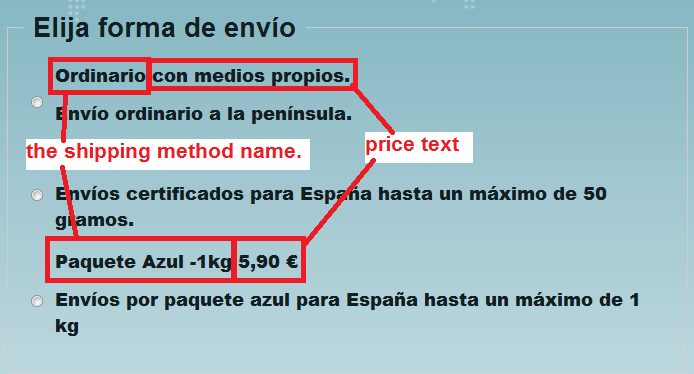 After confirming the cart you want to buy, when to choose the shipping method, payment text appears that complements the shipping method name. If the shipping method is priceless, showing the amount. If free text appears. What I want to change is the text that appears if the shipping method is free.