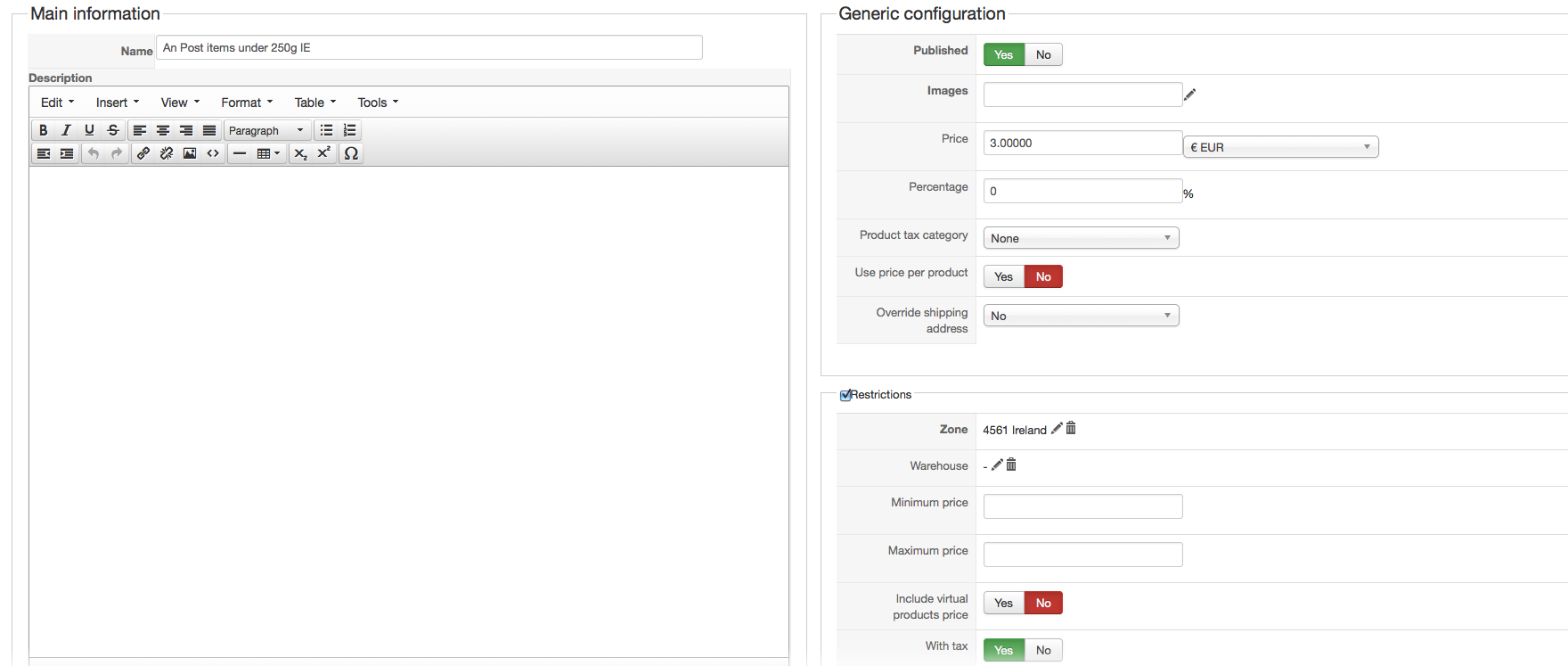 I attached the product page configuration of the product I've been testing, I made sure that in both cases I set up grams, as I said the weight settings work if I have no zone restrictions so I presume that's where the problem is.