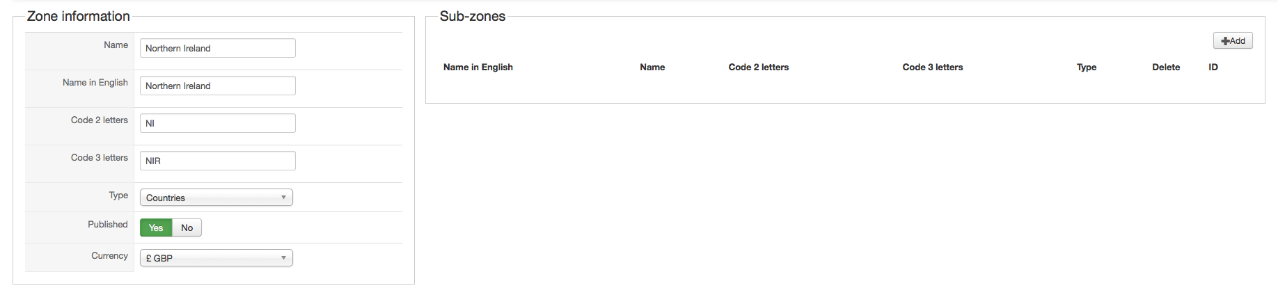 - Add every zones which are on the "Northern Ireland" through the "sub-zones" tab.