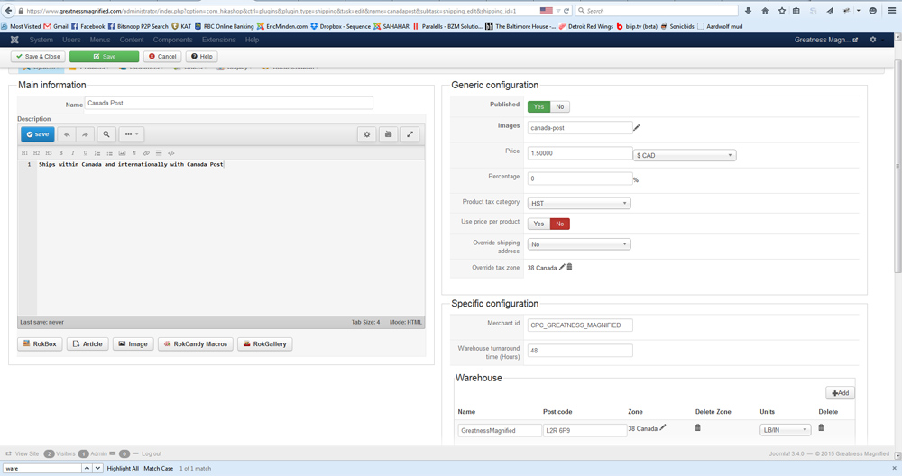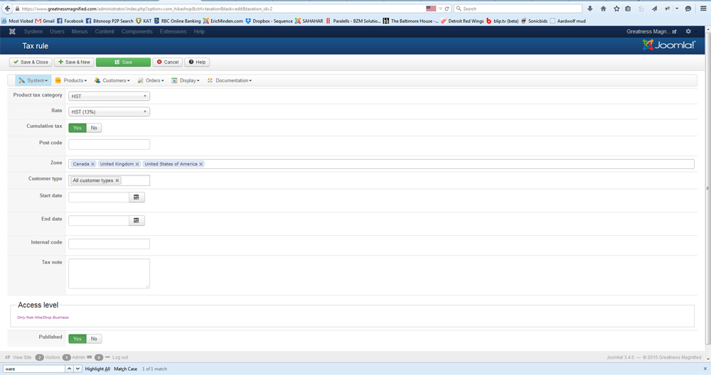 I have recently tried adding in sales tax but even with sales tax unpublished in the "taxes" section and switched off in both the Canada Post Shipping configuration and Product configuration I still get this error.