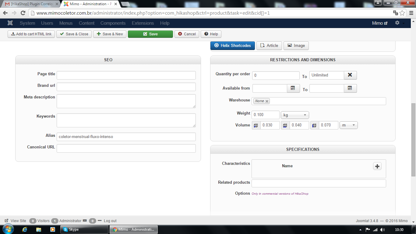 Can you show me some screenshots of how you configured your Correios shipping method and the dimensions/weight of the product in your cart ?