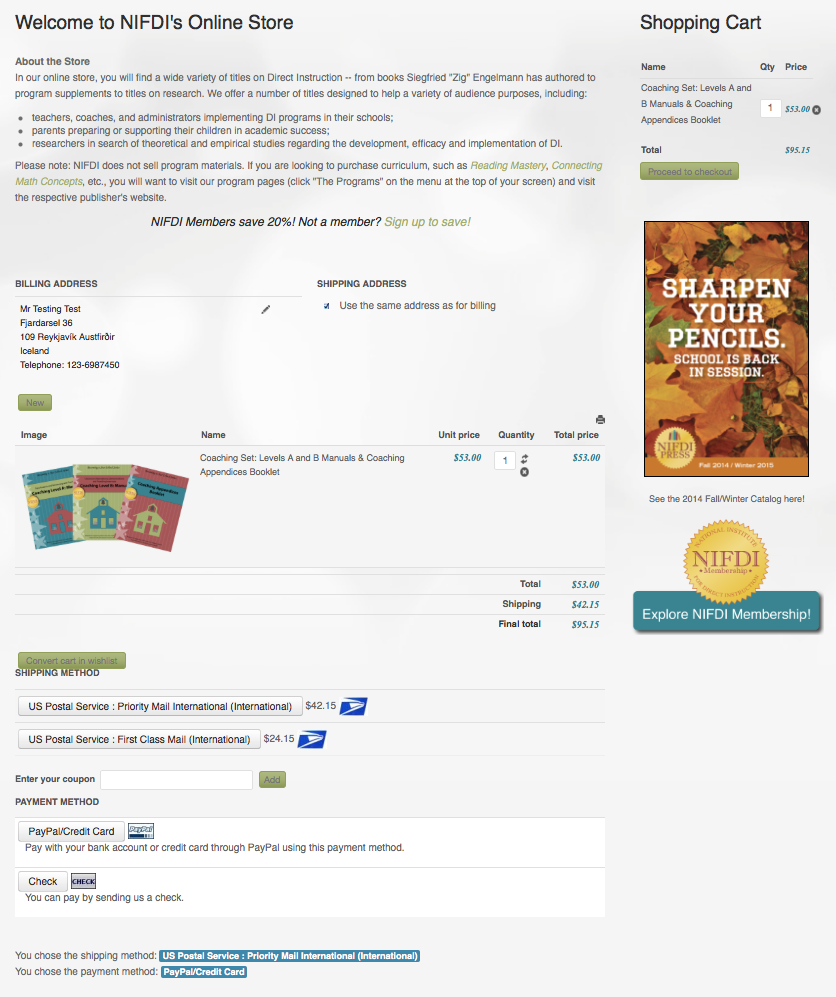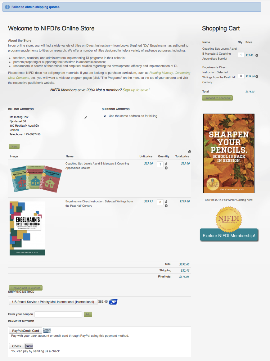 To recreate it, simply visit our store at www.nifdi.org/resources/store , add several items to the cart and proceed to checkout, shipping to anywhere outside of the US (I've been using Iceland as my example because that is where this problem arose) and I expect you to see this problem.