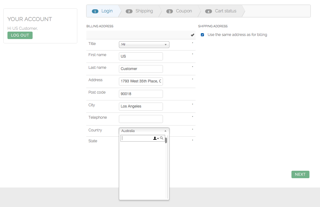 When I tried to log in as US customer using Safari, the drop down list of countries was blank. It did not respond to search and always bounced back to Australia. GRRRR! Used Firefox to get around that but I bet customers won't. See attached png.