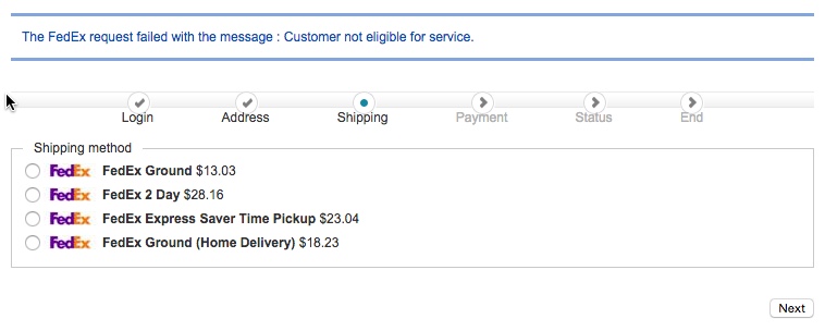 "The FedEx request failed with the message : Customer not eligible for service." That is from turning on FedEx Smart Post.