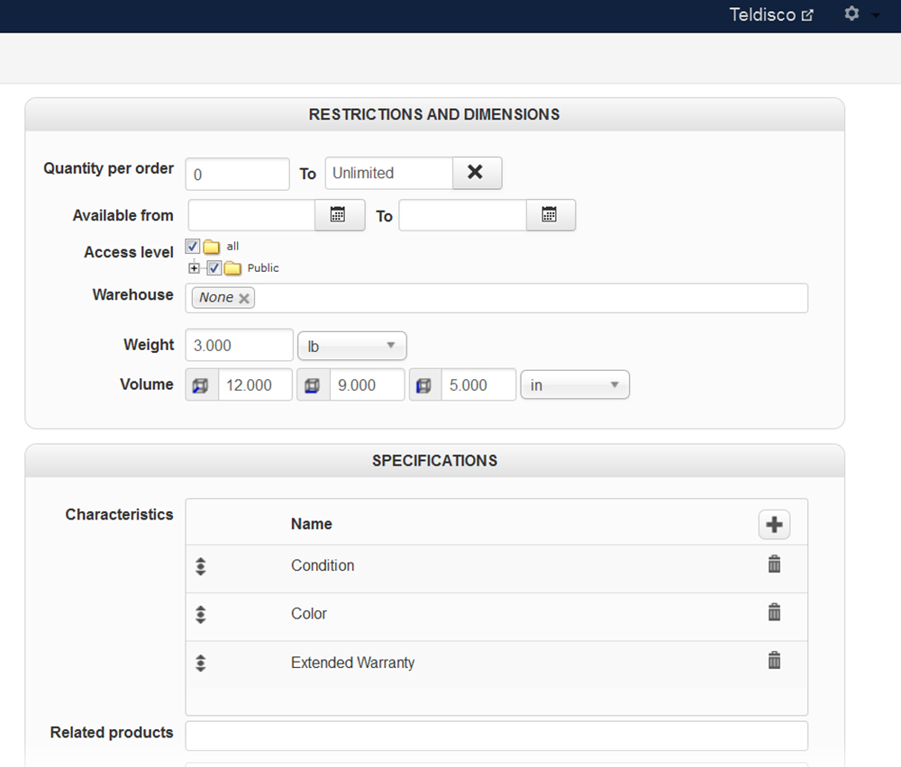 The product has variants and these have dimensions set up as well. I'm attaching screenshots: