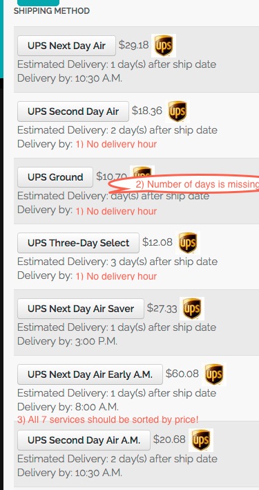 2. If it's not displayed for the UPS ground, that means that the UPS platform doesn't return that information, I just tested it on my end, and no information about the delivery day/time were sent.
