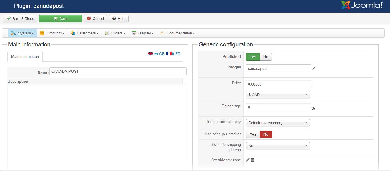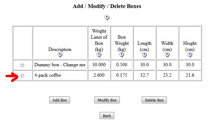 4) A box with the specific dimensions (32.7 cm x 23.2cm x 21.6cm ) and weight (0.175kg) has been added to the Canada Post settings since I could not set the grouping specifications in HikaShop. Each product has dimensions specified as well (20cm x 16cm x 11 cm)