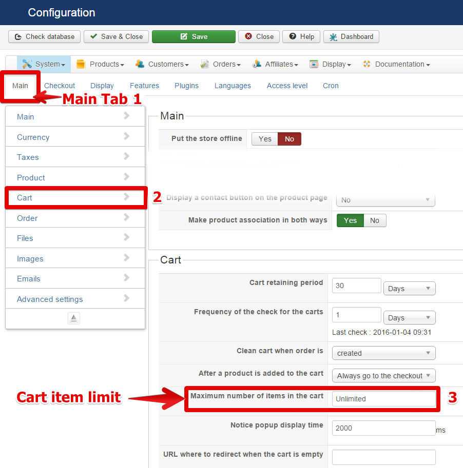 HikaShop => Configuration, in main tab 1, go main cart options 2, check cart item limit 3