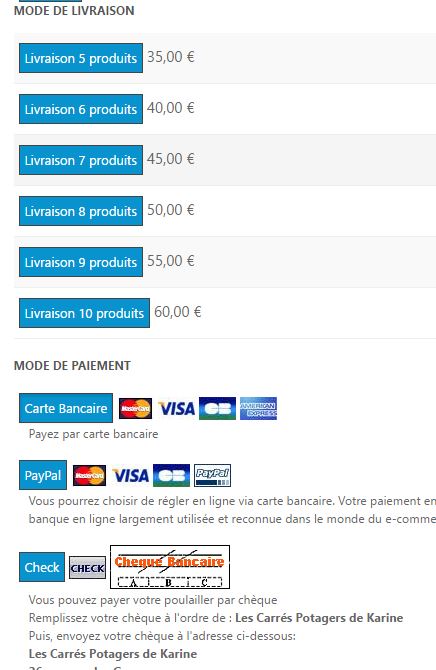 Le premier produit est à 15€ de frais de livraison et j'ajoute 5€ pour chaque nouveau produit.