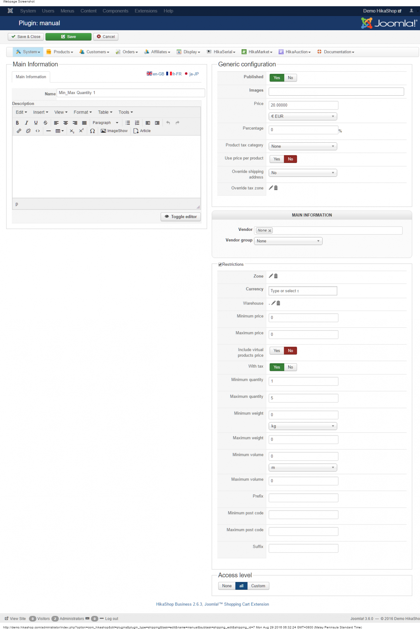 This is the screen after i "save and close" restriction of minimum quantity 1 and maximum quantity 5 on demo.hikashop.com