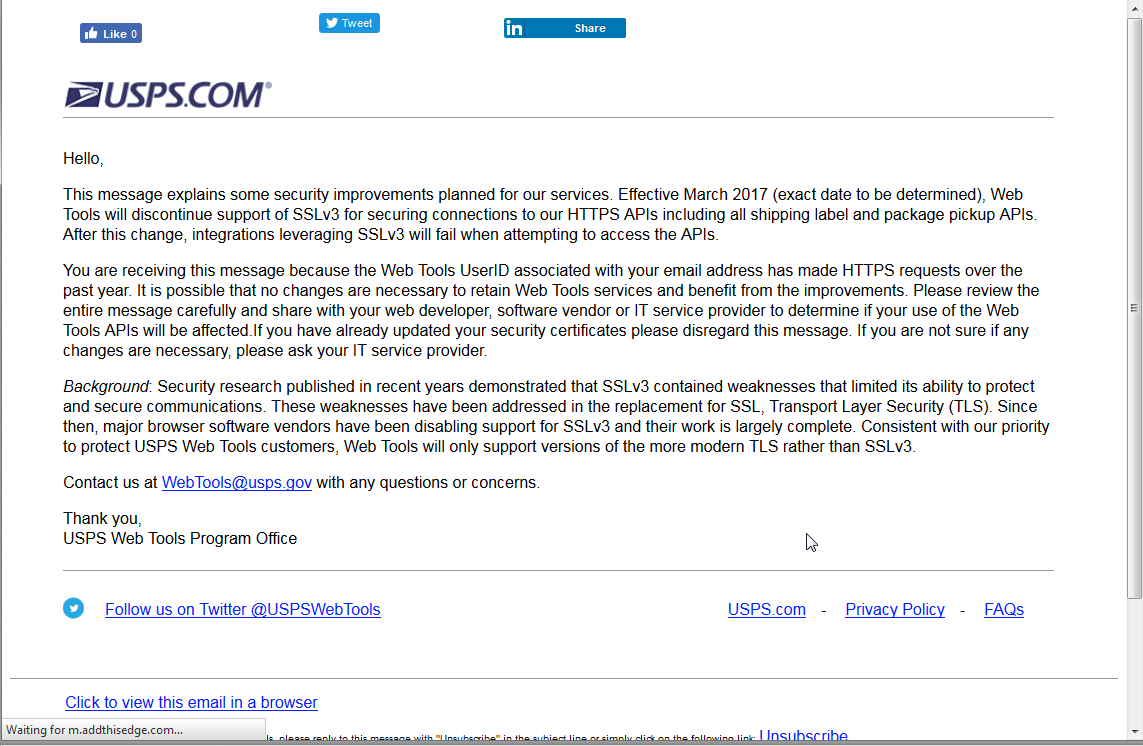 You are receiving this message because the Web Tools UserID associated with your email address has made HTTPS requests over the past year. It is possible that no changes are necessary to retain Web Tools services and benefit from the improvements. Please review the entire message carefully and share with your web developer, software vendor or IT service provider to determine if your use of the Web Tools APIs will be affected.If you have already updated your security certificates please disregard this message. If you are not sure if any changes are necessary, please ask your IT service provider.