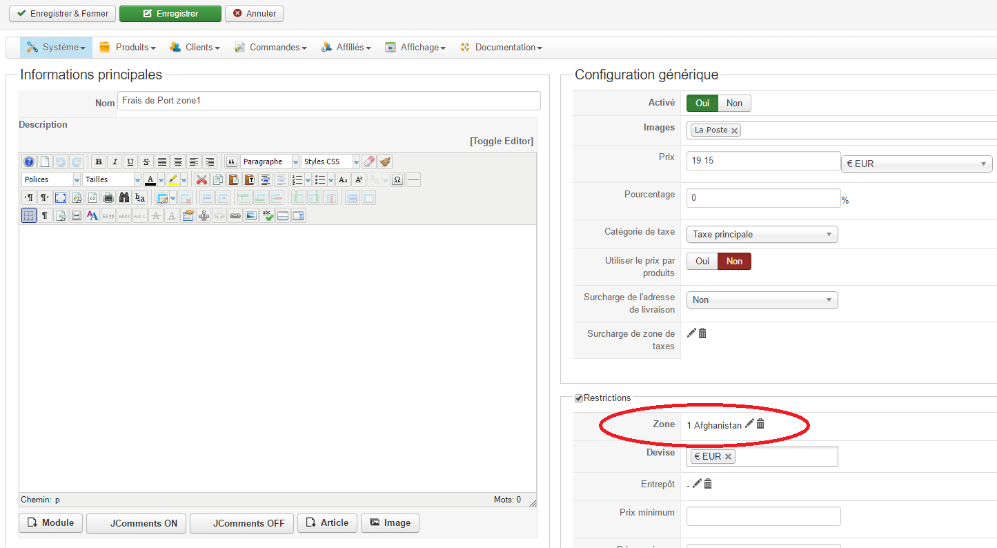 Je ne réussis pas à associer un frais de port à plusieurs zones !