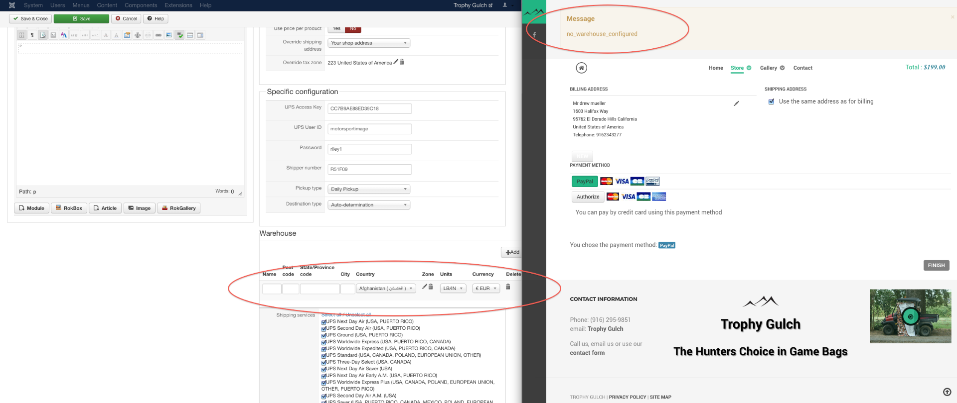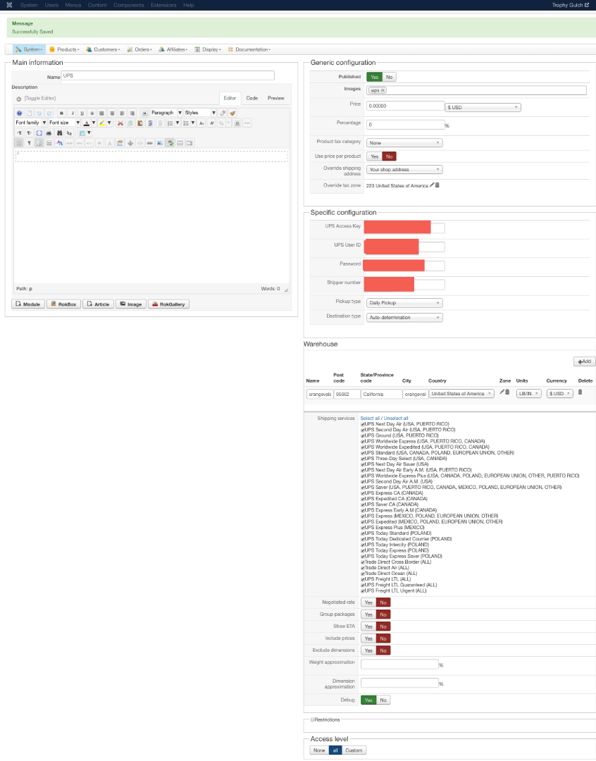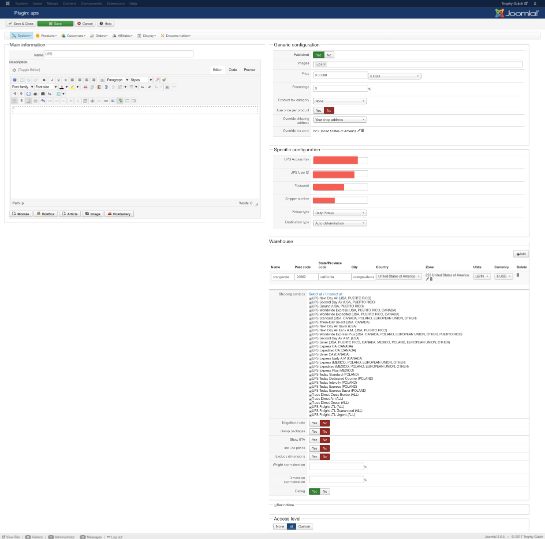 Also, note that in your case, you won't need to add any warehouse on your products. UPS warehouses are different than Hikashop warehouses, so all you need to do for the moment is to properly configure your UPS shipping method, and to add weight and dimensions to your products.