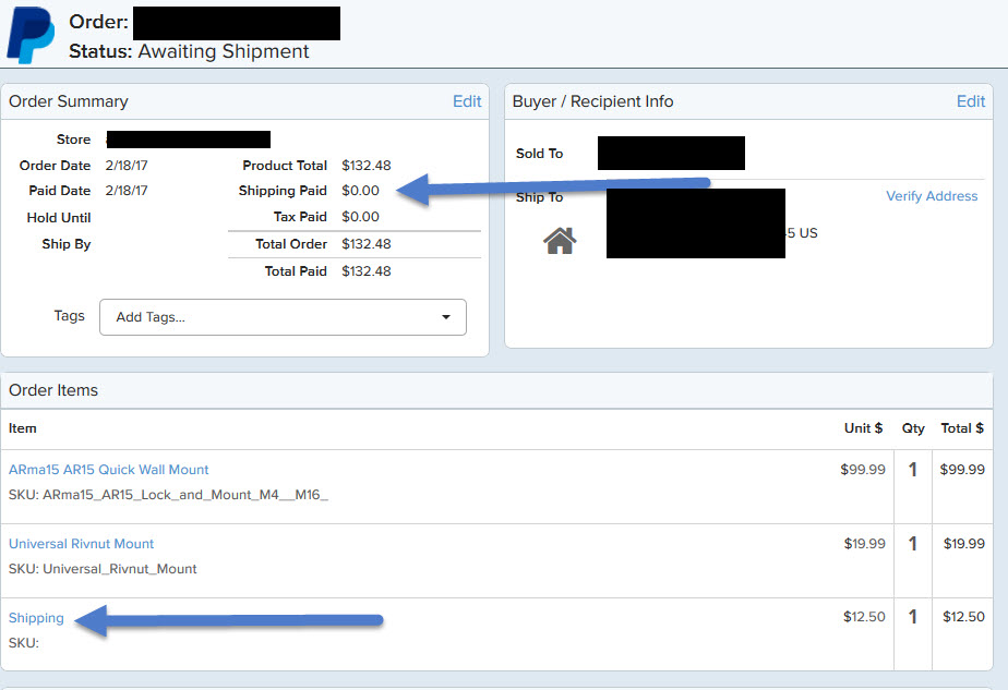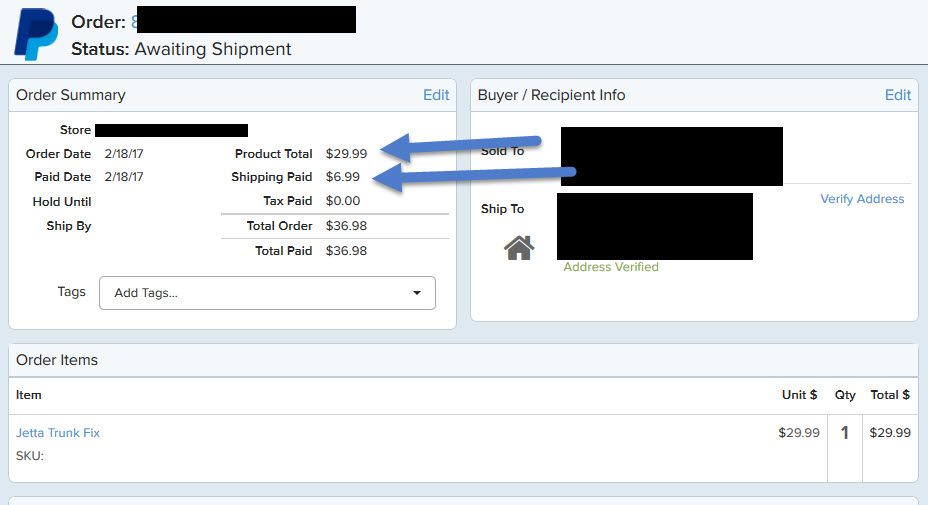 On this one you can see the "shipping paid" first arrow is 0.00, this should be 12.50 but instead if you see in the details look at second arrow it is labeling shipping as an "order item" rather than in the "shipping paid"