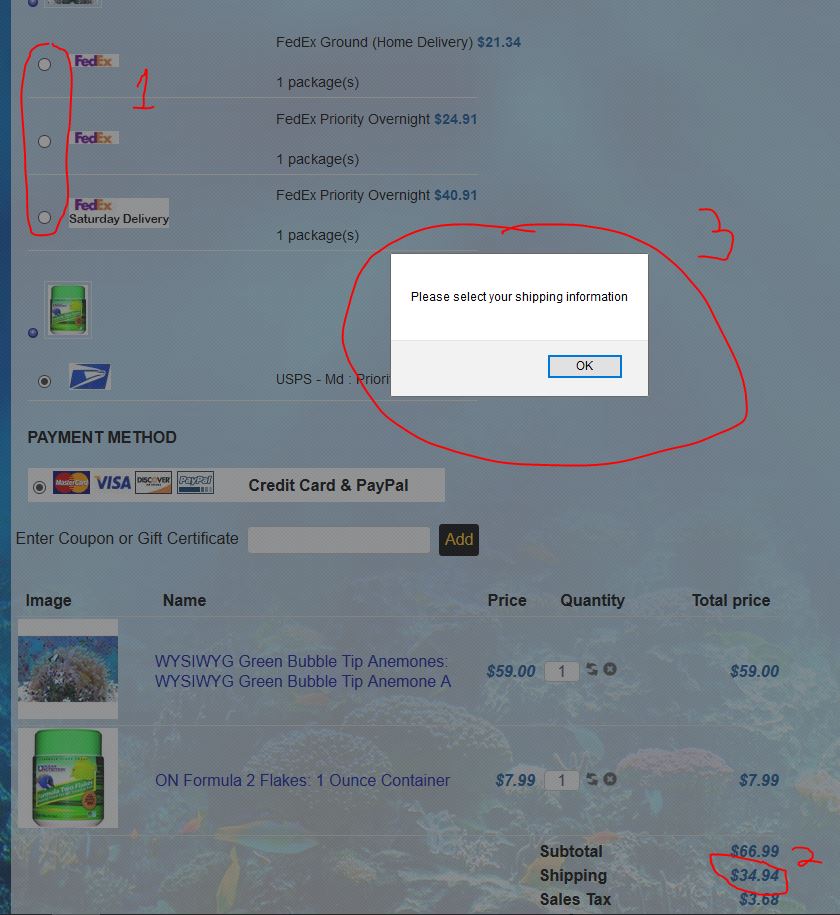 This website sells both live aquarium fish and dry fish supplies and are sent from different warehouses with different shipping methods (fedex and usps). When both a live item and a supply is chosen we are unable to choose the two different shipping methods/warehouses (radio button won't select) and we get an error to "Please select your shipping information" when addresses are filled out properly and selected properly.
