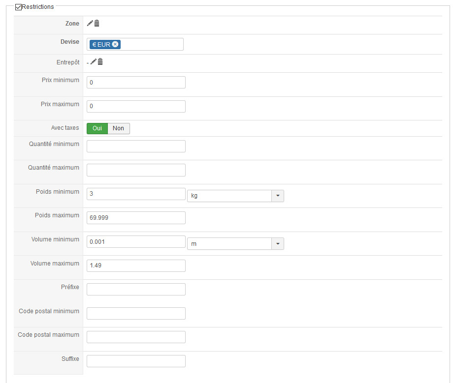 Pourriez vous tester cela sans aucune restriction (de poids, volume, ...) via la page de configuration de votre méthode de livraison ?