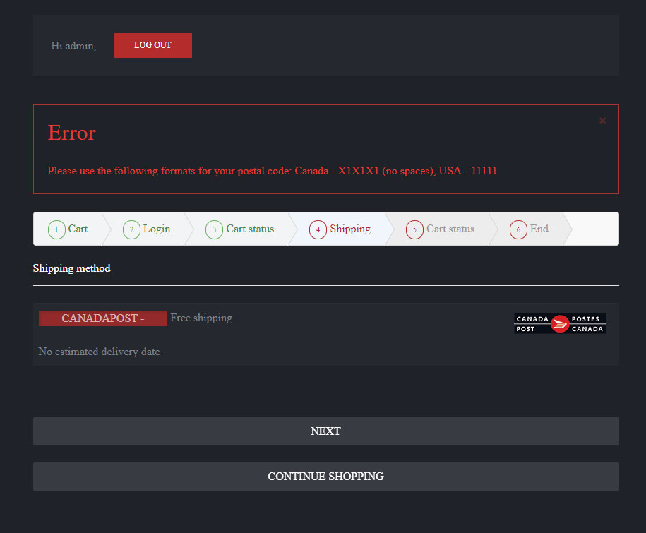 - If a purchaser enters an invalid postal code (ie: X1X 1X1) which is supposed to be Canada Post's format but doesn't work with the Canada Post plugin, then they receive a custom error message, however they are STILL PERMITTED to continue with the purchase which indicates Free Canada Post shipping.