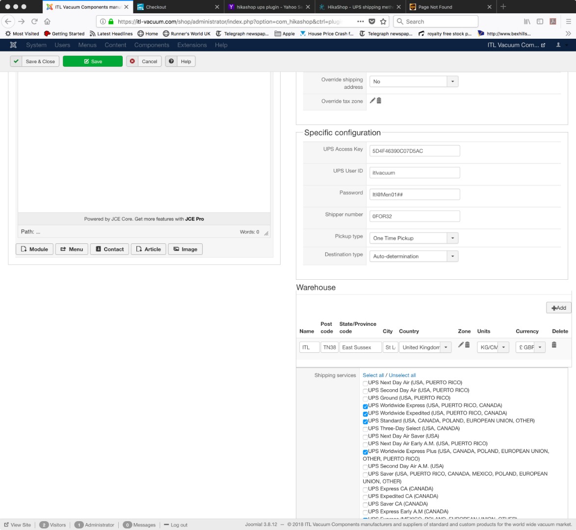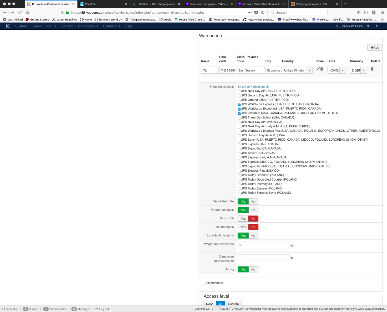 - "Group packages", "Negotiated rate", "Exclude dimensions", and "Weight/Dimmnsion approximation" options of your UPS shipping configuration page via "Hikashop->System->Shipping methods"