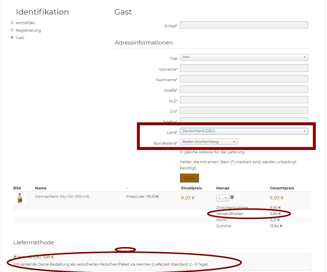 When I enter now the shopping cart and select GUEST as checkout, I can select all Countries (Germany, Austria, Switerland) and in the Dropdown below based on the country the regions. But when I select for example Austria as Country, the shipping cost stay extacly the same (Germany), nothing changes based on that selection.