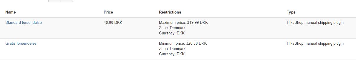 I have tried to make two shipping methods using restrictions, so orders up to DKK 399,99 have a shipping fee and orders from DKK 400 and more has free shipping, but it does not work.