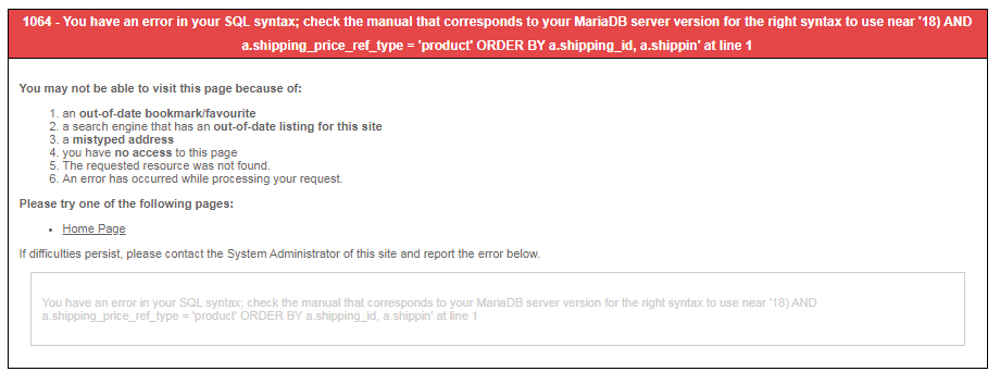 1064 - You have an error in your SQL syntax; check the manual that corresponds to your MariaDB server version for the right syntax to use near ') AND a.shipping_price_ref_type = 'product' ORDER BY a.shipping_id, a.shippi...' at line 1 SELECT a.shipping_id, a.shipping_price_ref_id as `ref_id`, a.shipping_price_min_quantity as `min_quantity`, a.shipping_price_value as `price`, a.shipping_fee_value as `fee`, a.shipping_blocked as `blocked` FROM jos_hikashop_shipping_price AS a WHERE a.shipping_id IN (2) AND a.shipping_price_ref_id IN () AND a.shipping_price_ref_type = 'product' ORDER BY a.shipping_id, a.shipping_price_ref_id, a.shipping_price_min_quantity