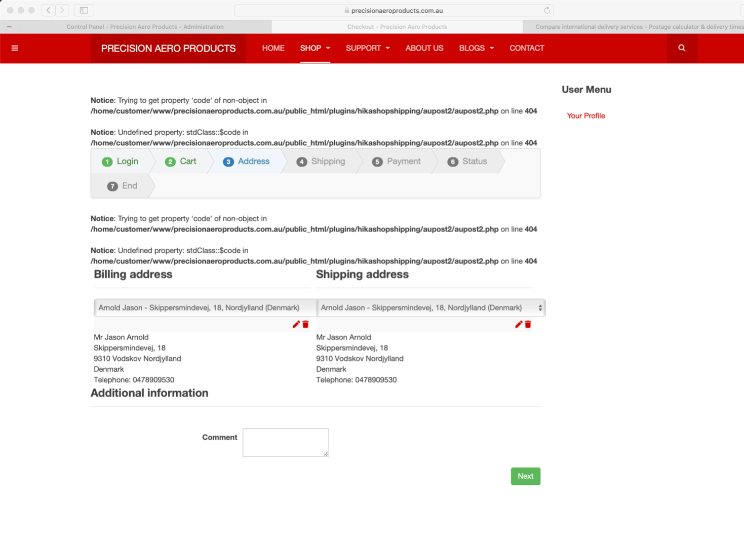 Notice: Trying to get property 'code' of non-object in /home/customer/www/precisionaeroproducts.com.au/public_html/plugins/hikashopshipping/aupost2/aupost2.php on line 404