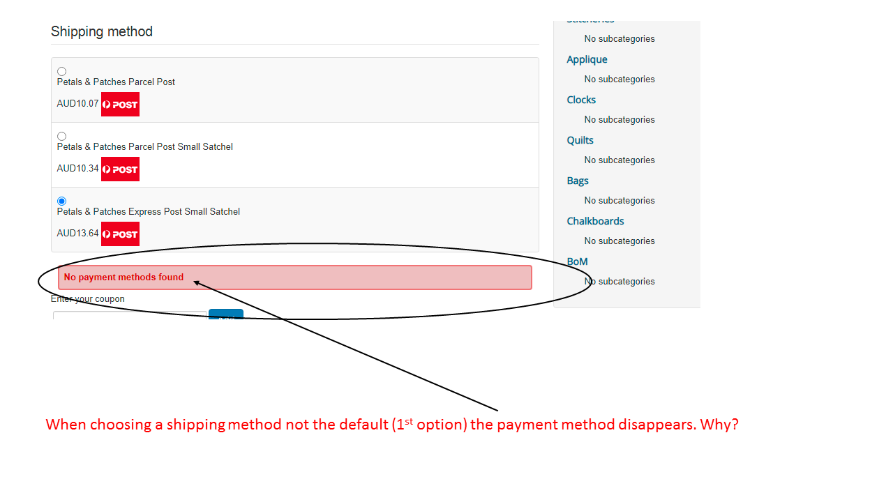 However if I choose another Aust. post shipping method I lose the payment method and get an error message No payment methods found".