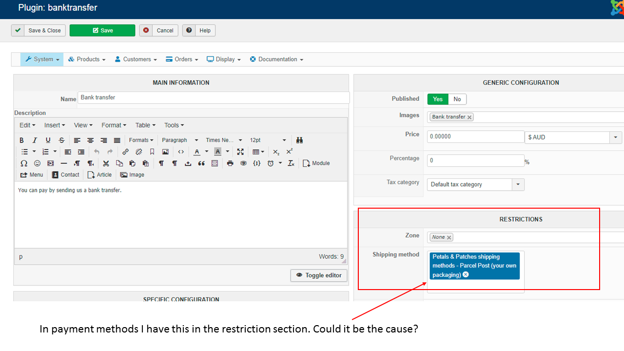 When I leave the default Aust Post shipping method I can see the payment method (bank transfer).