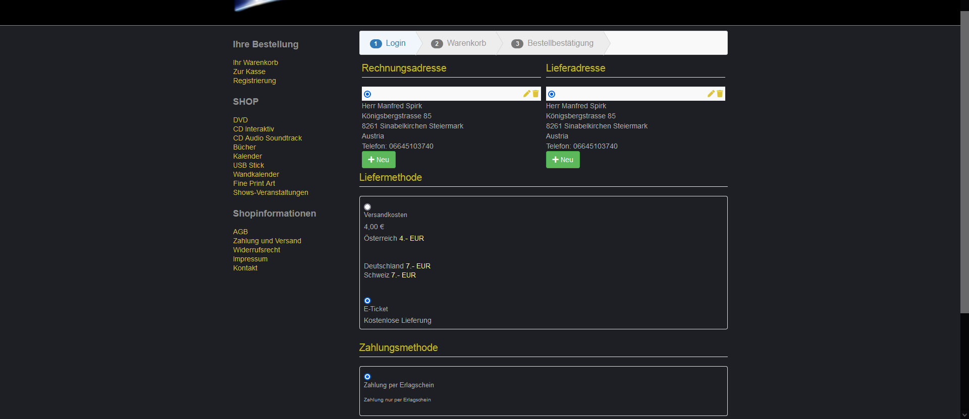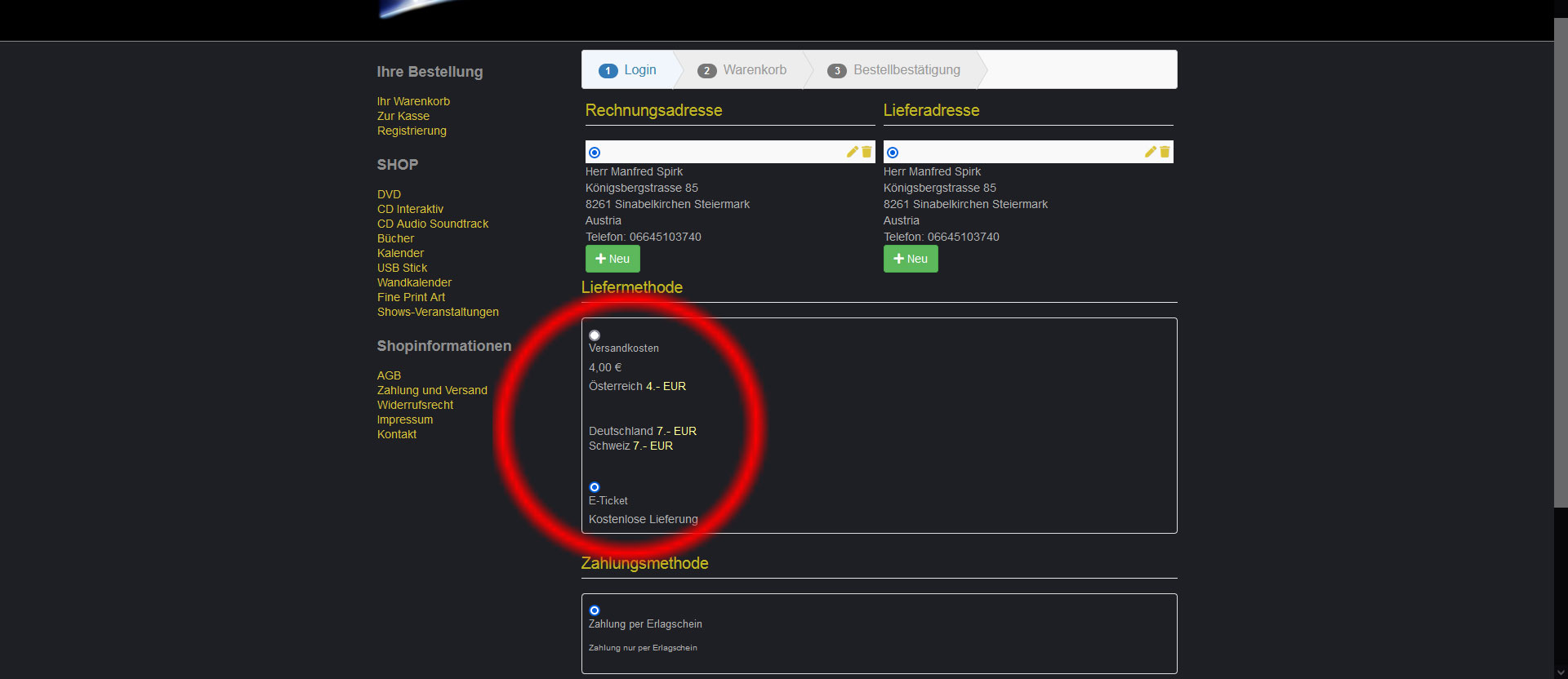 Im Checkout Modul werden sowohl bei den Versandgütern als auch bei den E-Tickets jedoch beide Liefermethoden zur Auswahl angezeigt, d.h. jeder der ein Buch bestellt, könnte die Versandkosten von E-Tickets um € 0,00 auswählen und würde keine Versandkosten bezahlen.
