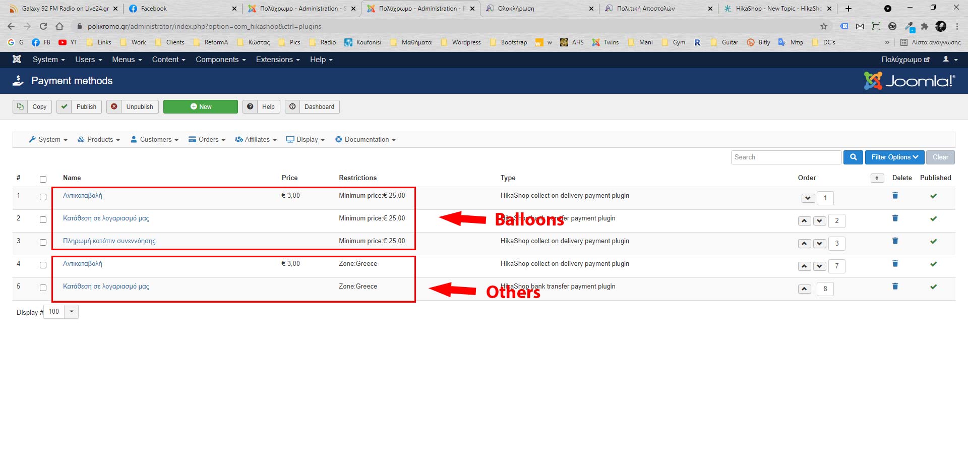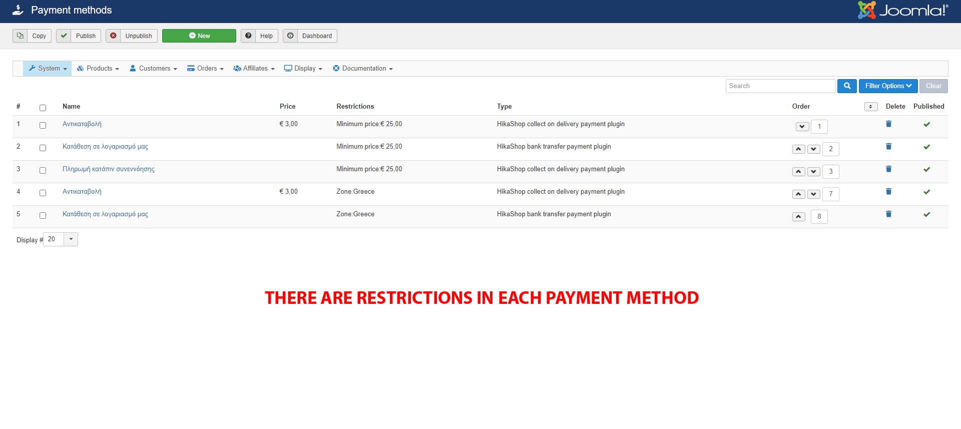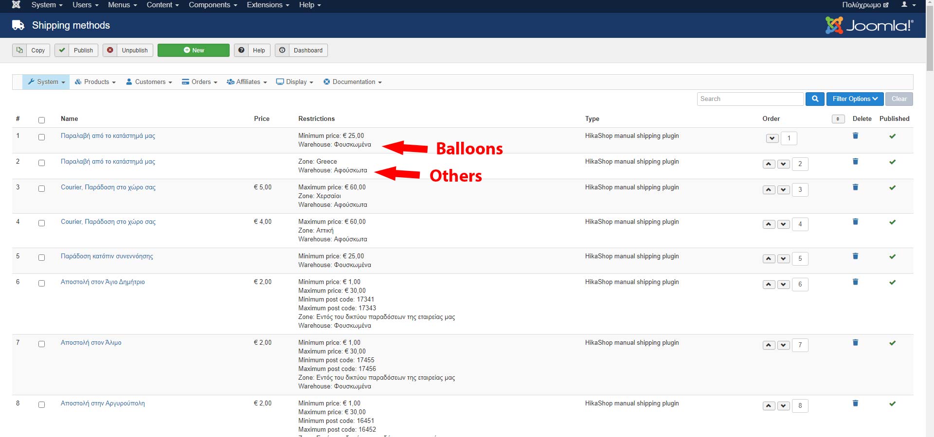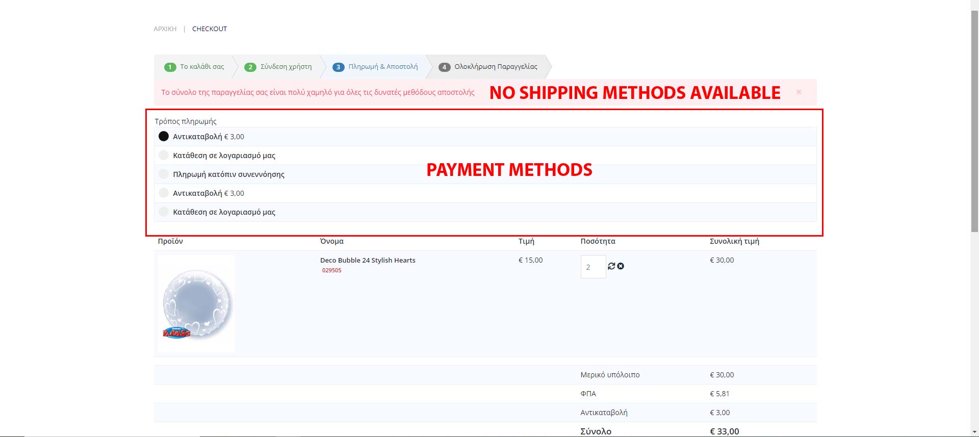 If you select any other state besides Αττική in your shipping address and continue to the next step, you will see that all the payment methods still display. That applies only for the Warehouse "Φουσκωμένα" (Balloons).