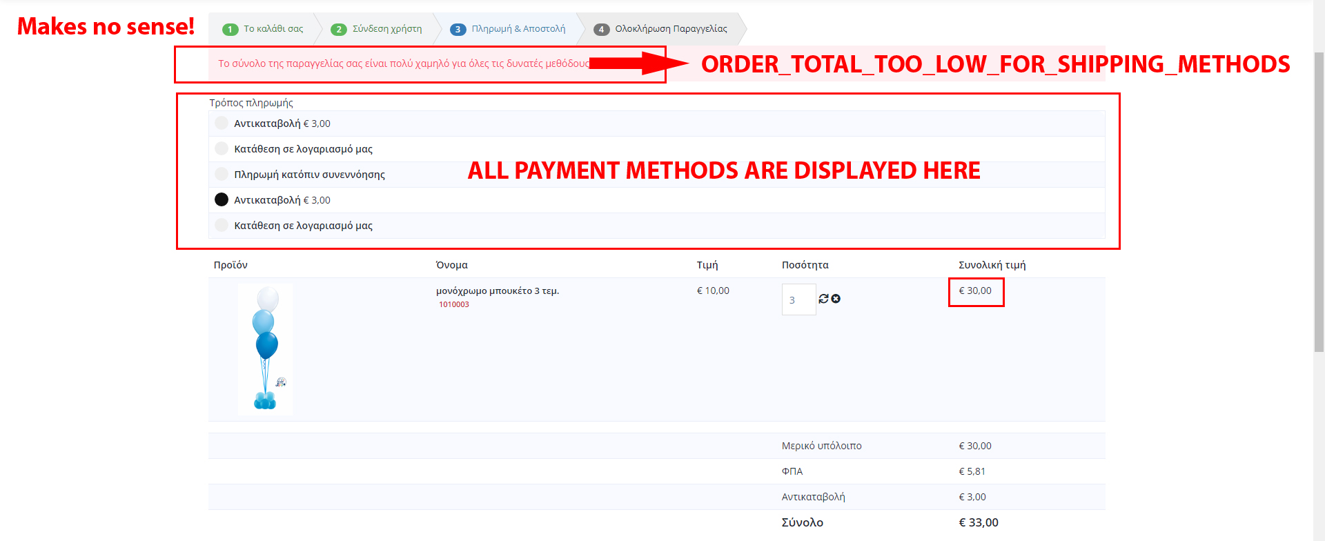 In the screenshot, the product belongs to the "Balloons" warehouse but the shipping address is not within the areas we deliver but in that case as a result i get the message "ORDER_TOTAL_TOO_LOW_FOR_SHIPPING_METHODS" and all the payment methods are displayed. That is not correct.