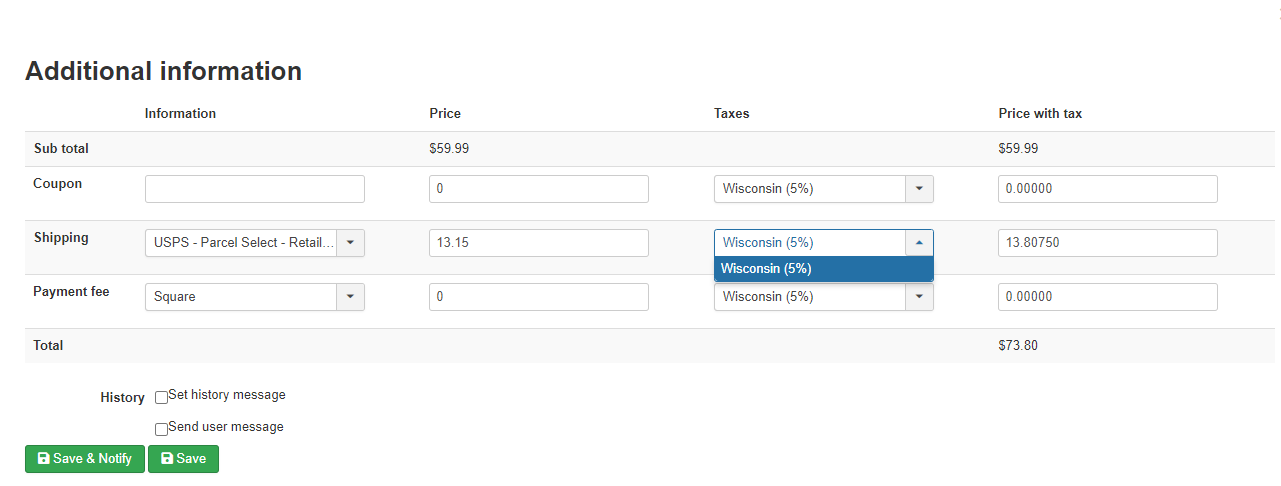 Please see the screen shots supplied...one of the selection box in the order where I updated the rate to $13.15 and have the selection box open showing NO other selections except to charge the customer tax.
