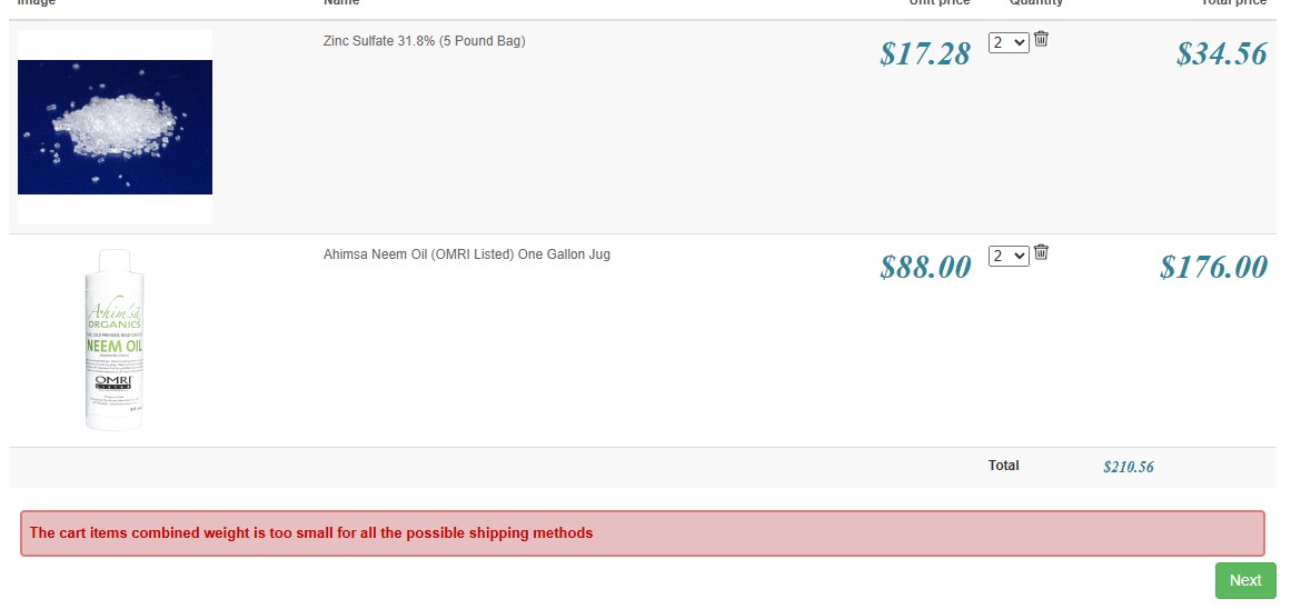 I am getting the error "The cart items combined weight is too small for all the possible shipping methods" on all my products on my website that weigh anything from 2-3lbs to 150 lbs.