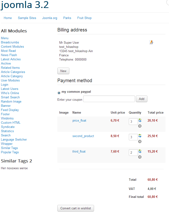 Please see the 2 attached screenshots. Problem is that during the checkout process, when a buyer purchases 2 or more of the same product (which is very likely), the total amount is shown wrongly during checkout. Just by a few cents. It looks like hikashop is taking the pre-tax price, multiplying it by the number ordered and then adding the tax back on, rather than just multiplying the tax-included price. (see screenshot 1). It's only out by a few cents, but it looks stupid, like I don't know how to calculate. Strangely, the e-mail confirmation of the order (see screenshot 2) is fine. How can I get the price shown during checkout to look the same as the correct price on the confirmation e-mail?