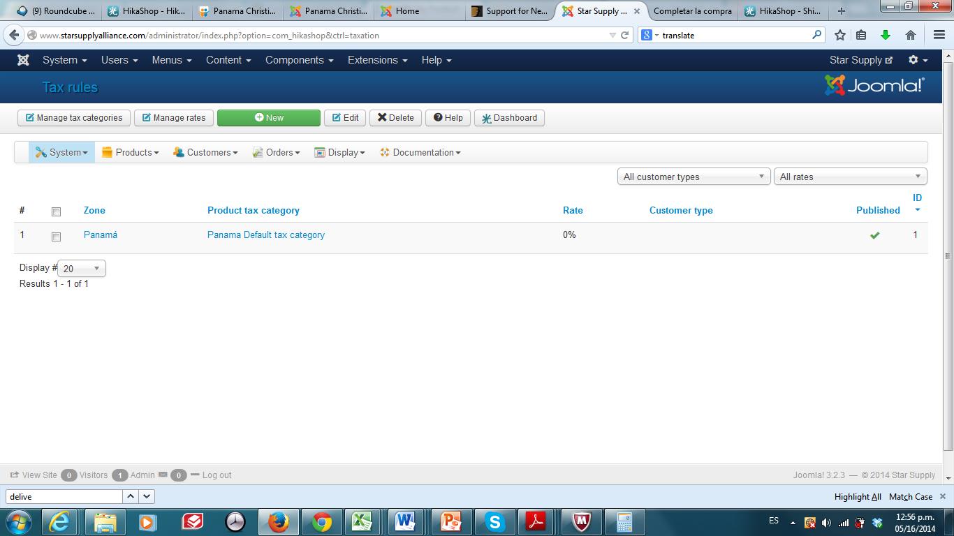 Once you set a tax rate via the "manage rates" button of the System>Taxes menu, you can create a tax rule which will link the tax rate and the tax category via the "new" button of the System>Taxes menu.
