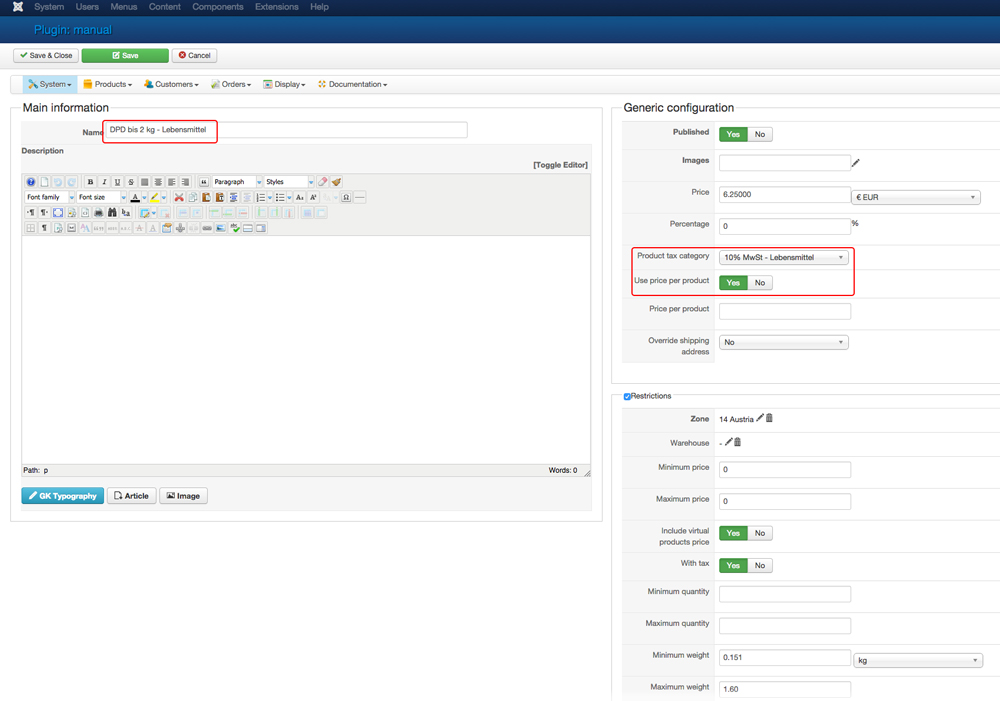 Neto: 6,25€ + 10% Tax = 6,88€