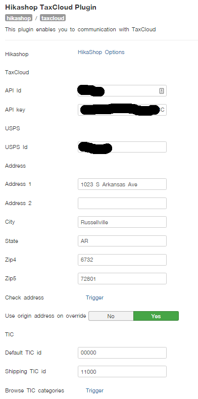 Here are screenshots of the settings. TaxCloud API credentials are blurred out: