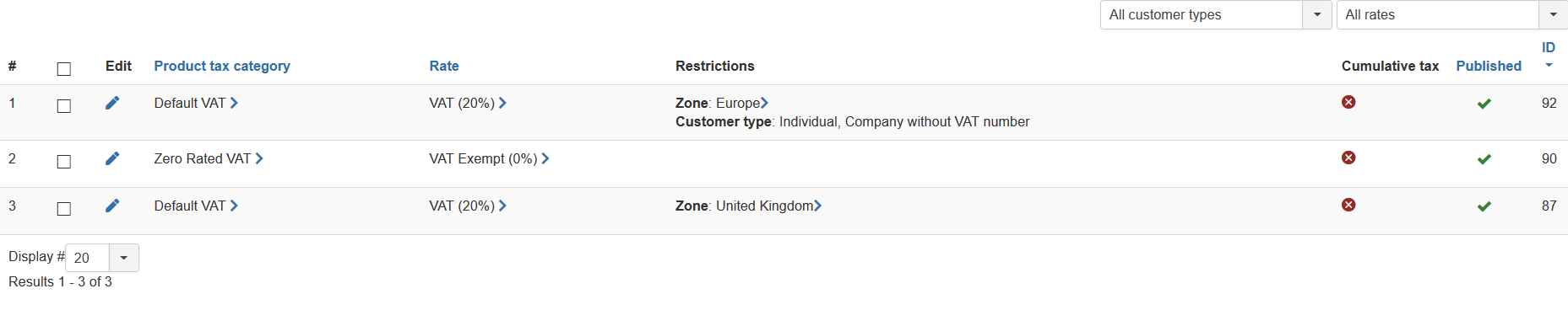 - Your second tax rule is for another tax category. So if your products are all linked to the "default VAT" tax category, that tax rule will never apply.