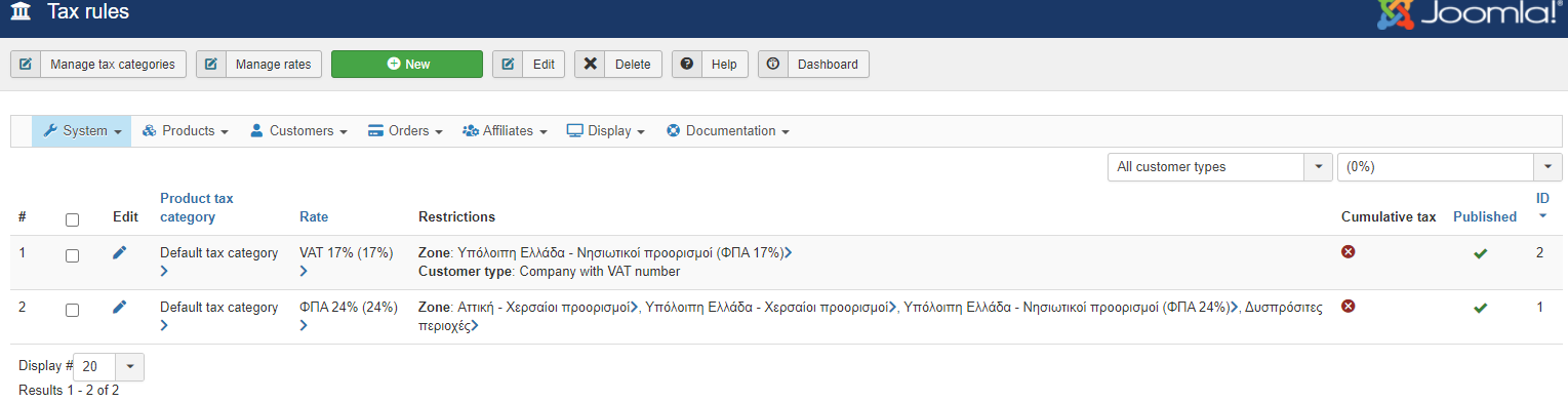 I have 1 Default tax category with 2 rates. 17% and 24% depending on the address zone
