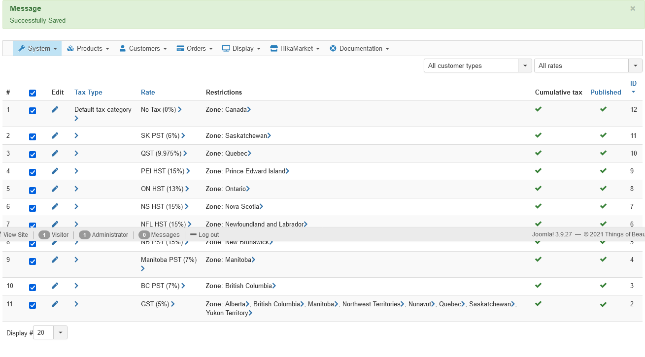 Since every province has a different tax rate, I've set up the default as zero, and then each province and territory as cumulative, linked to the zone.